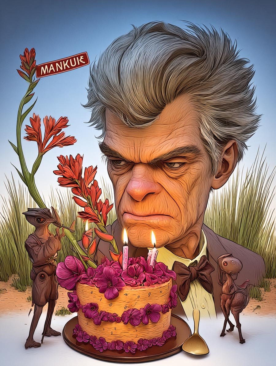 Mankuks missmutiger Ehrentag - Ein Geburtstagskind der besonderen Art: Mürrisch blickt der Jubilar auf seine Torte, umgeben von skurrilen Gratulanten und einer rätselhaften Straßenschild-Botschaft "MANKUK". Eine Feier, die mehr Fragen als Antworten aufwirft. Mankuk… ...