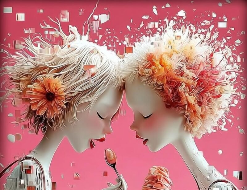Zwei Mädchen mit Eiscreme - Zwei zarte Gestalten mit blumengeschmücktem Haar teilen sich einen süßen Moment mit Eiscreme und einem Teddybären vor einem verspielten rosa Hintergrund. Eine Szene wie aus einem Traum, voller Leichtigkeit, digitaler… ...