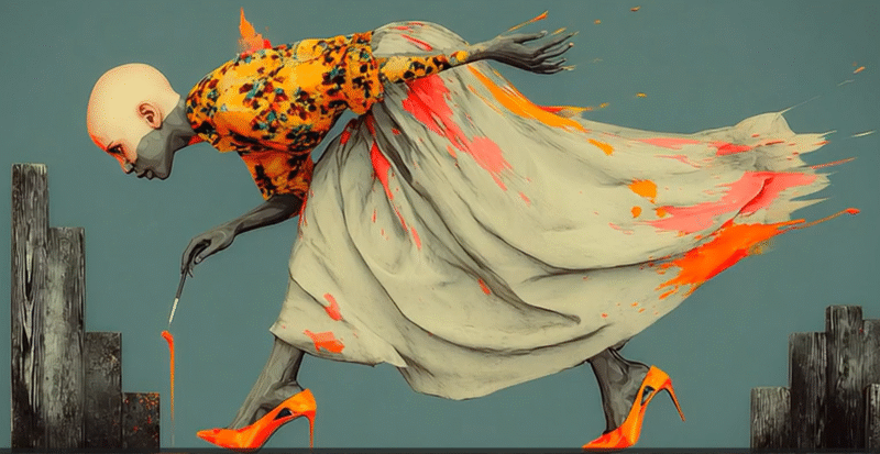 Die Architektin der Farbe - Sie ist die Architektin der Farbe. Mit jedem entschlossenen Schritt, der ihre leuchtenden Absätze auf den Boden klacken lässt, bricht sie die Monotonie auf. Ihr Pinsel taucht nicht in einen… ...