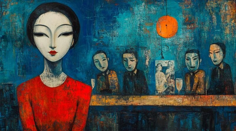 Die „Ehrwürdigen“ - Das auffälligste Element, das sich durch alle Bilder zieht, ist die prägnante Darstellung einer Frau in einem leuchtenden Rot, das wie ein Leuchtfeuer in der oft kühlen, blauen Farbpalette der… ...