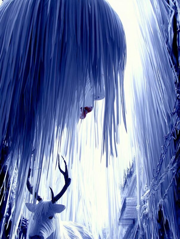 Eisige Ästhetik - Eine Frau mit langen, blauen, fringeartigen Haaren blickt von oben herab, während ein stilisierter weißer Hirsch mit großen Geweihen darunter zu sehen ist. Die Szene ist in Blau- und Weißtönen… ...