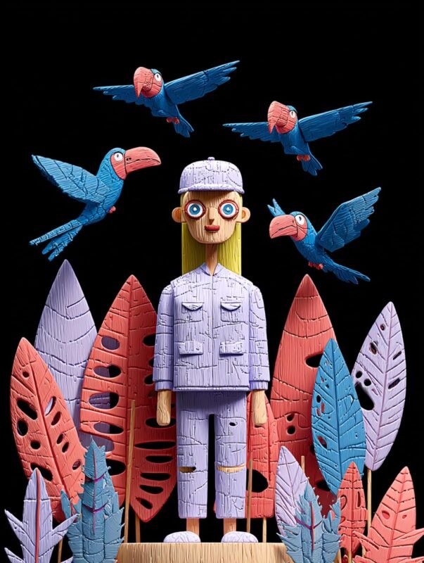 Wo Vögel flüstern - Eine Figur mit großen, runden Augen und einer Baseballkappe steht inmitten von bunten, stilisierten Blättern, umgeben von fliegenden blauen Vögeln. Es ist eine Szene voller Neugier und einer leichten, märchenhaften… ...