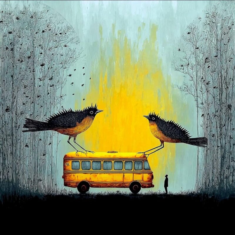 Auf dem Dach stehen zwei sehr große Vögel - Die Komposition ist weitgehend symmetrisch aufgebaut. Der Bus und die Vögel befinden sich in der Bildmitte und werden von vertikalen Elementen – den Bäumen – flankiert. Der Horizont ist tief… ...