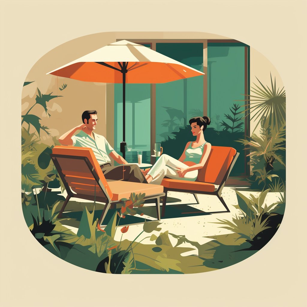 3 Freunde entspannen sich im Garten mit einem oder 2 Getraenken 3