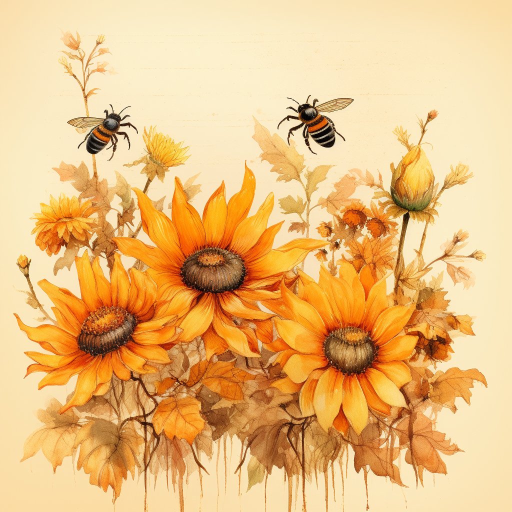 Aquarell Sonnenblumen und Bienen Silhouetten mit handgeschriebenen Herbst Gedichte gefuellt 2