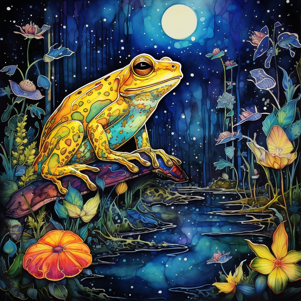 Ein gelber Frosch im Wald, Mond, Fluss 2