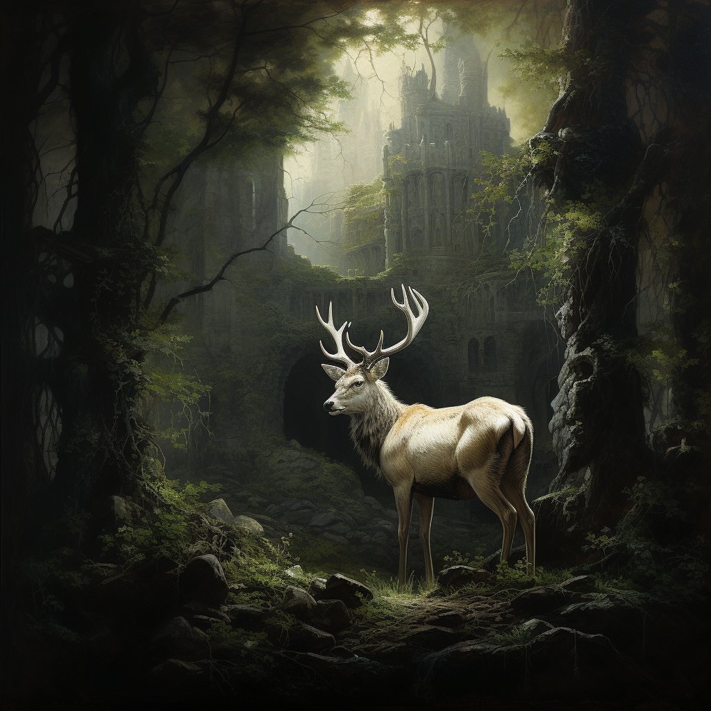 Ein koeniglicher weisser Hirsch, der inmitten von Ruinen in einem dunklen, geheimnisvollen Wald steht 3