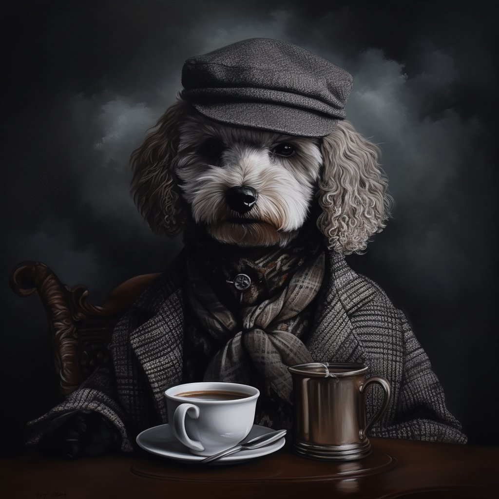 Ein kultivierter Pudel trinkt eine Tasse Tee, traegt einen Rollkragen und eine flache Muetze, rauchigen Hintergrund 2