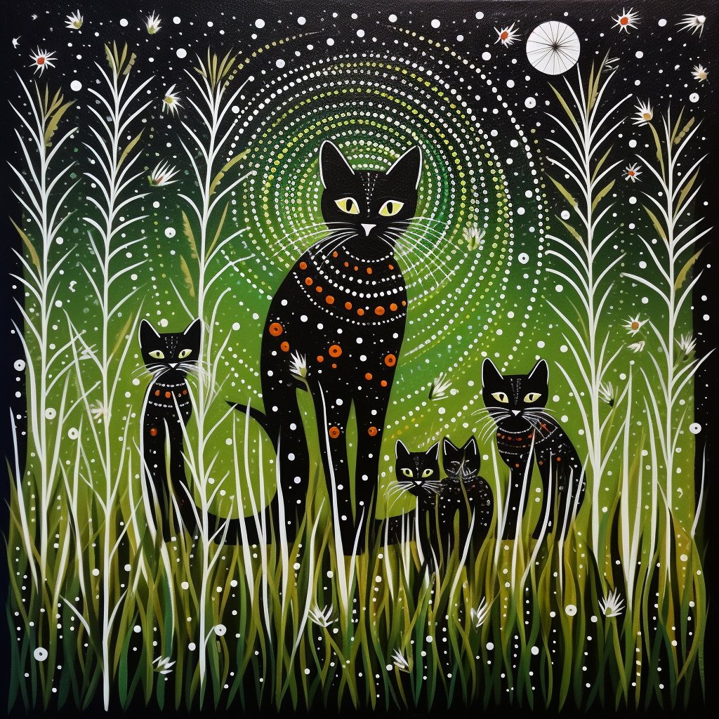 eine Katze saeugt ihre Kaetzchen im hohen gruenen Gras vor dem Haus 2