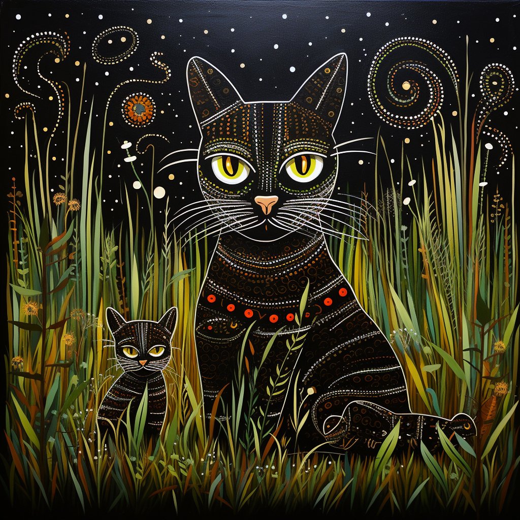 eine Katze saeugt ihre Kaetzchen im hohen gruenen Gras vor dem Haus 4