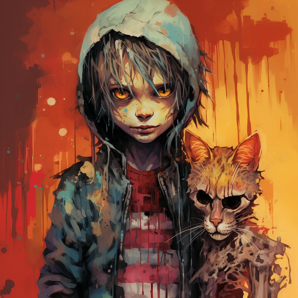 illustration einer katze und eines skelettjungen in farbenfroher kleidung 3