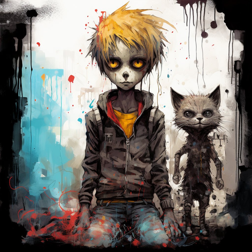 illustration einer katze und eines skelettjungen in farbenfroher kleidung 4