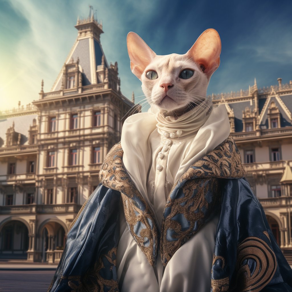 Sphynx-Katze im Ballkleid vor dem Hintergrund eines praechtigen Palastes im mittelalterlichen Stil 4