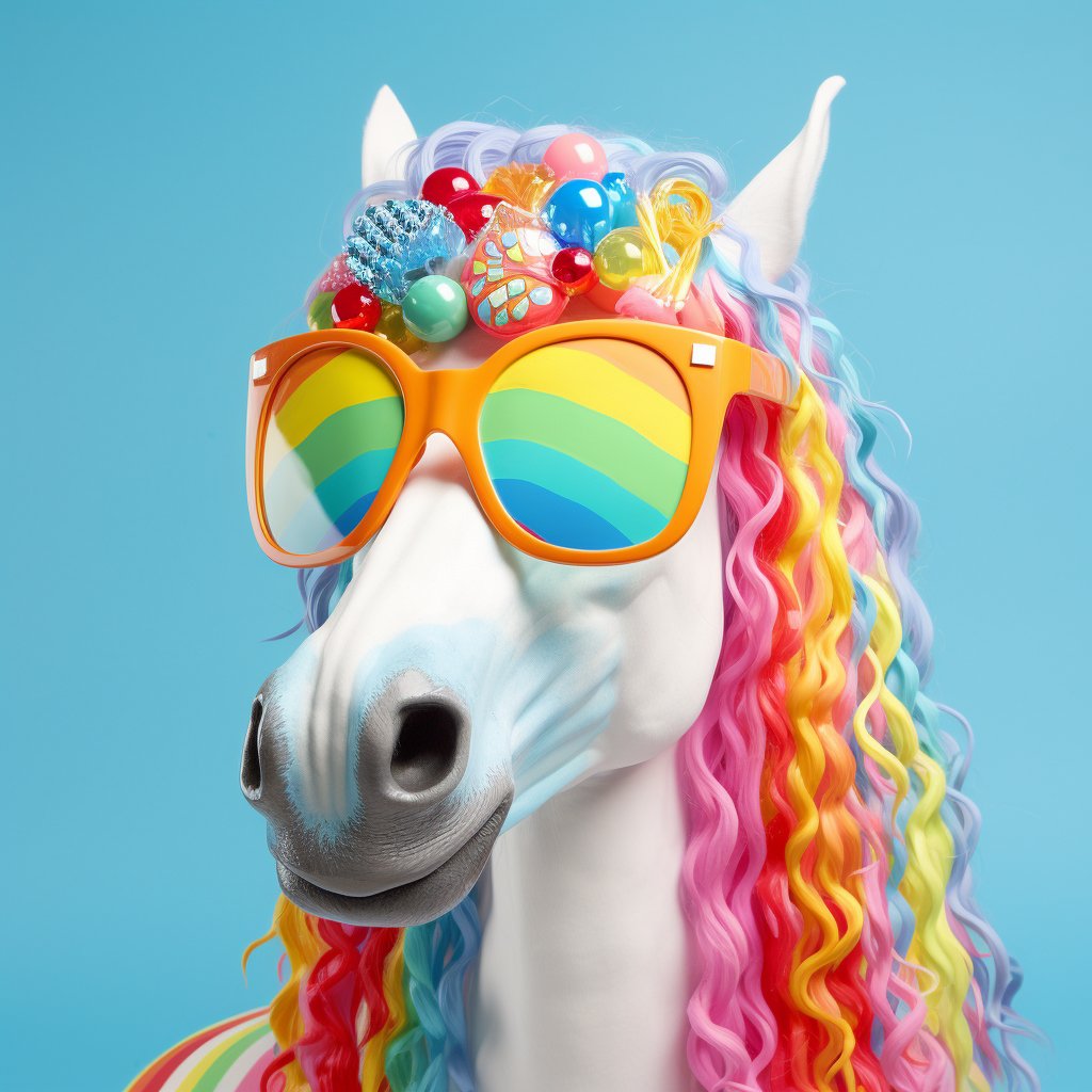 weisses Pferd mit Regenbogenbrille auf blauem Hintergrund 4