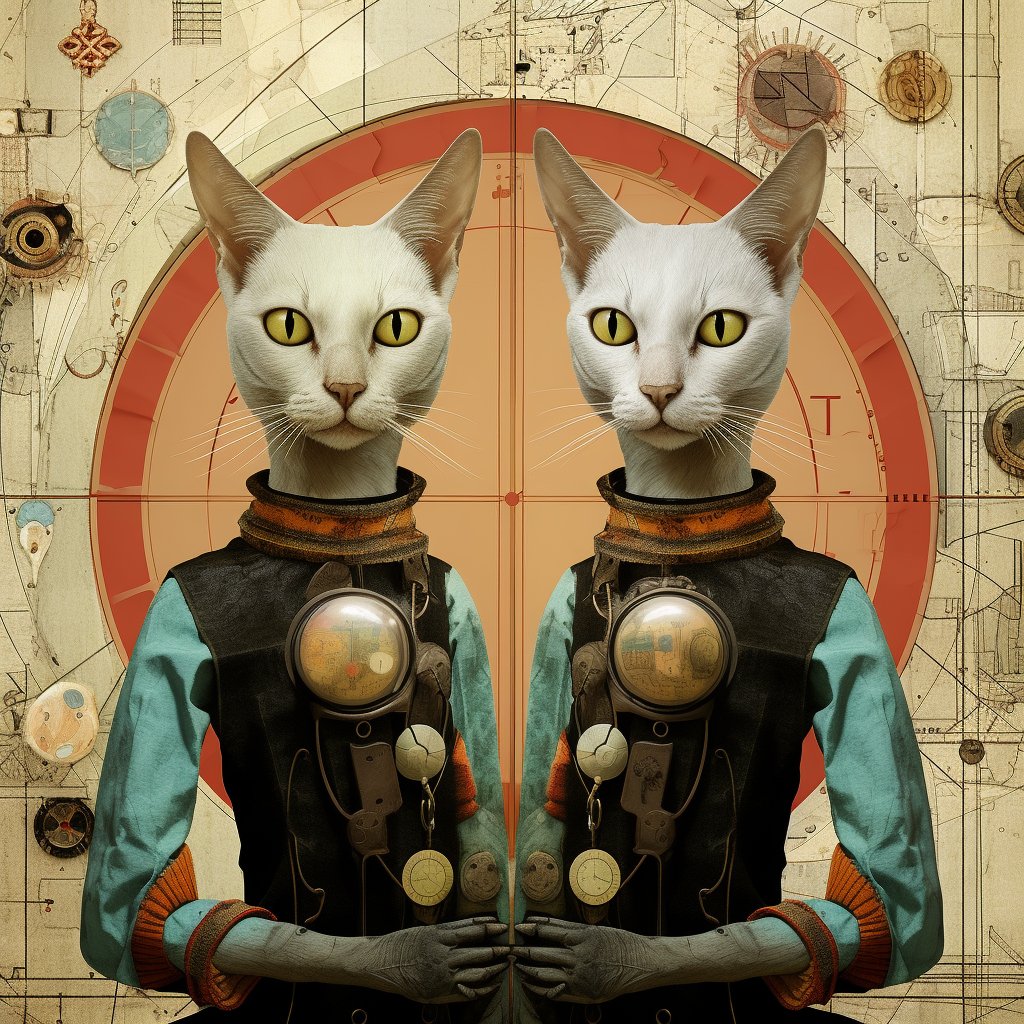Zwei antropomorphe Katzen, Kater und Katze, Kubrickian Synthetic 4
