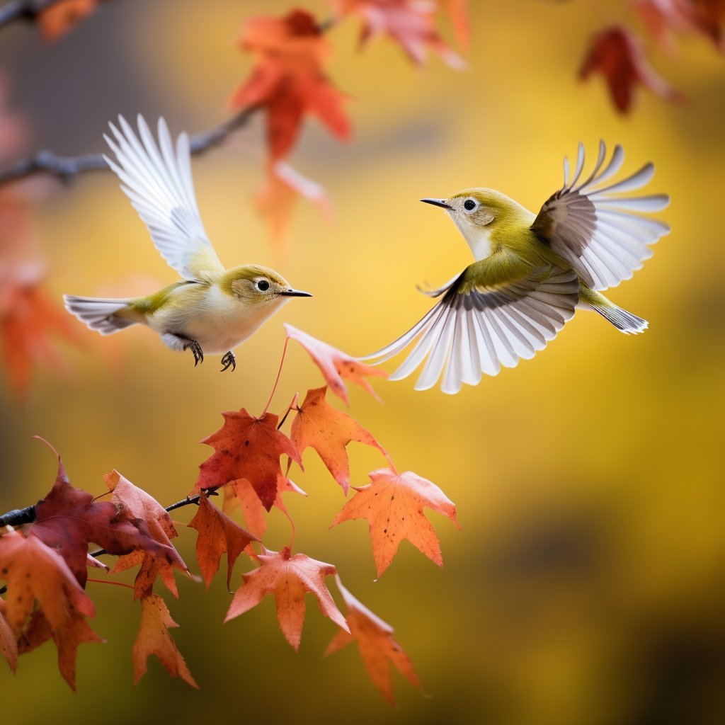 Zwei super suesse gruene Weissaugenvoegel spreizen ihre Fluegel und fliegen in den herbstlichen Ahornblaettern 3