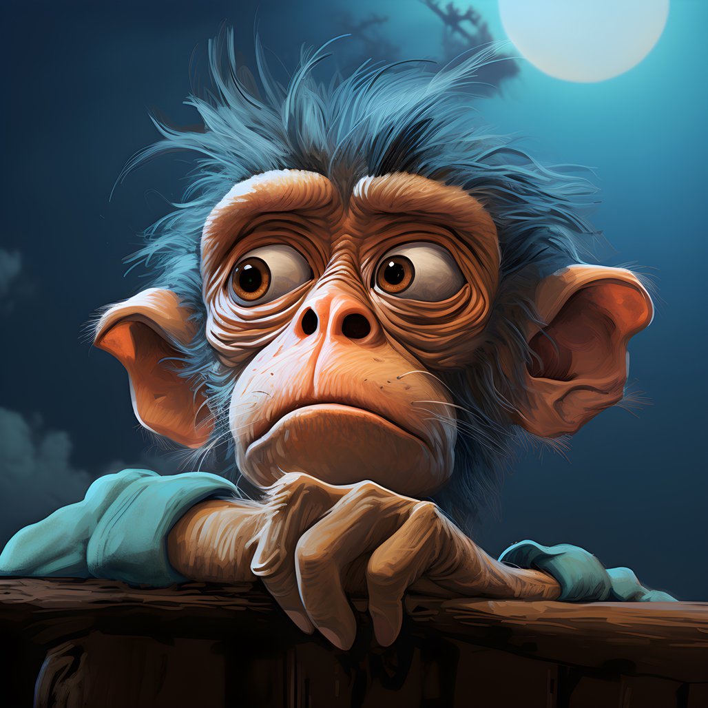 this is a drawing of a joey monkey with an eye in the style of emotive surreal character studies, colorized, pensive poses, topcor 58mm f/1.4, caricature-like illustrations, #vfxfriday, solarizing master 1