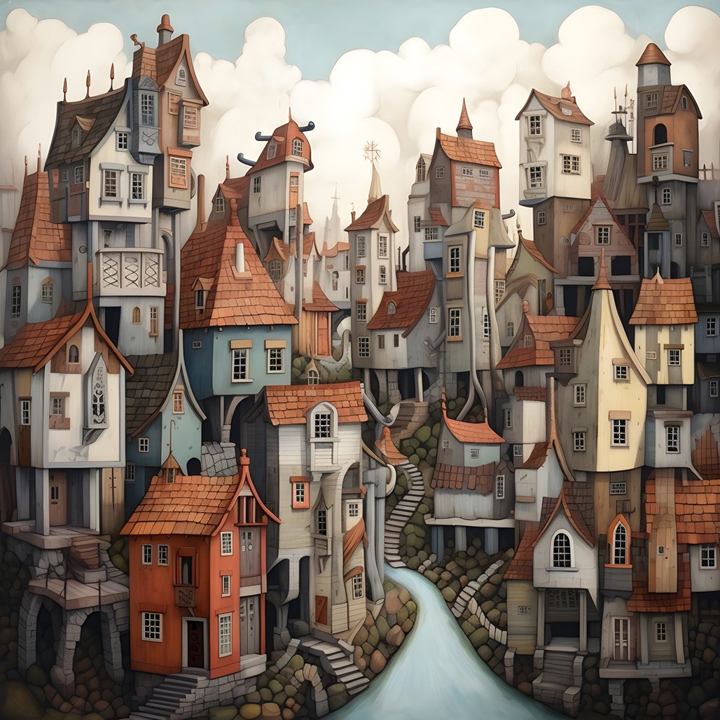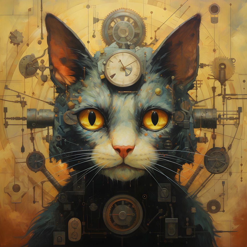 Neo-expressionism of a cartoon cat looking up at something curiously 3