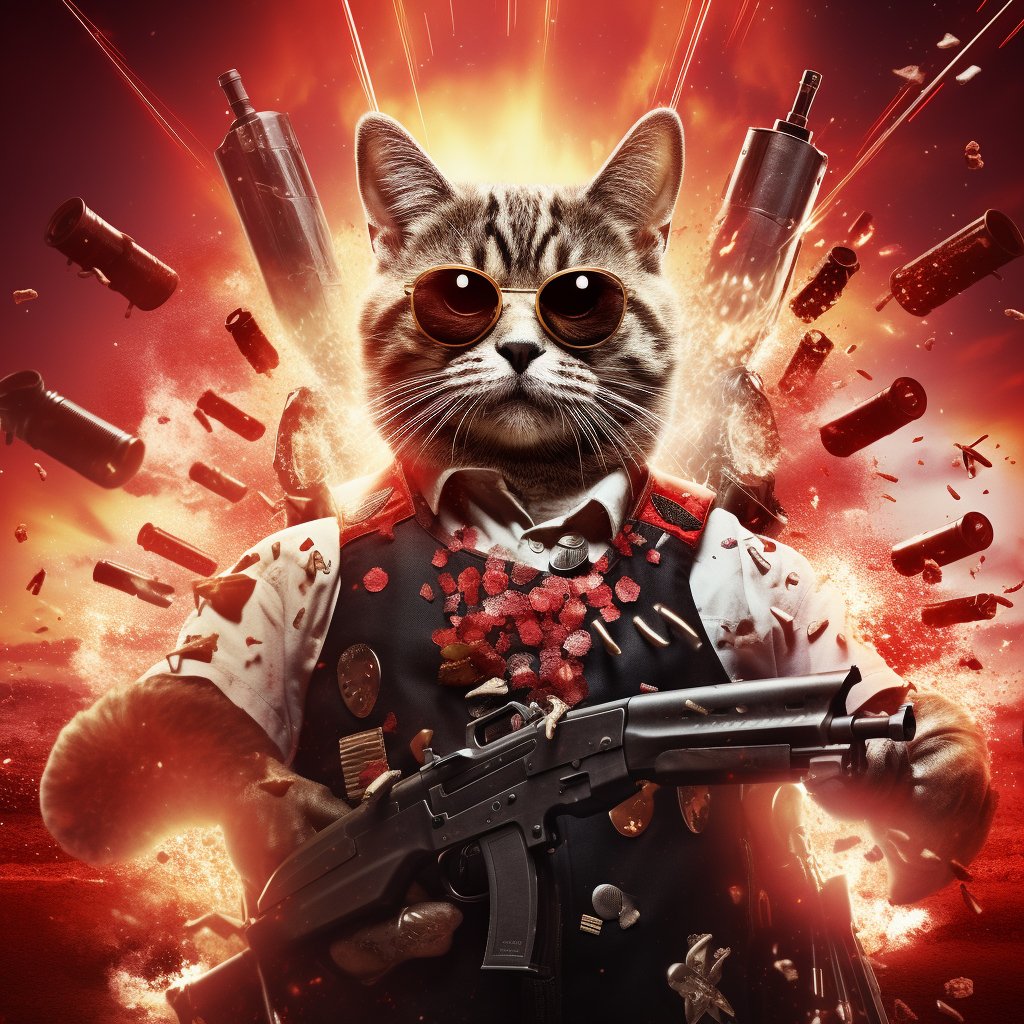 Filmplakat einer Katze, die ein schwarz-weiss gepunktetes Hemd und eine glaenzende Sonnenbrille traegt, mit Explosionen und Kanonen im Hintergrund 4