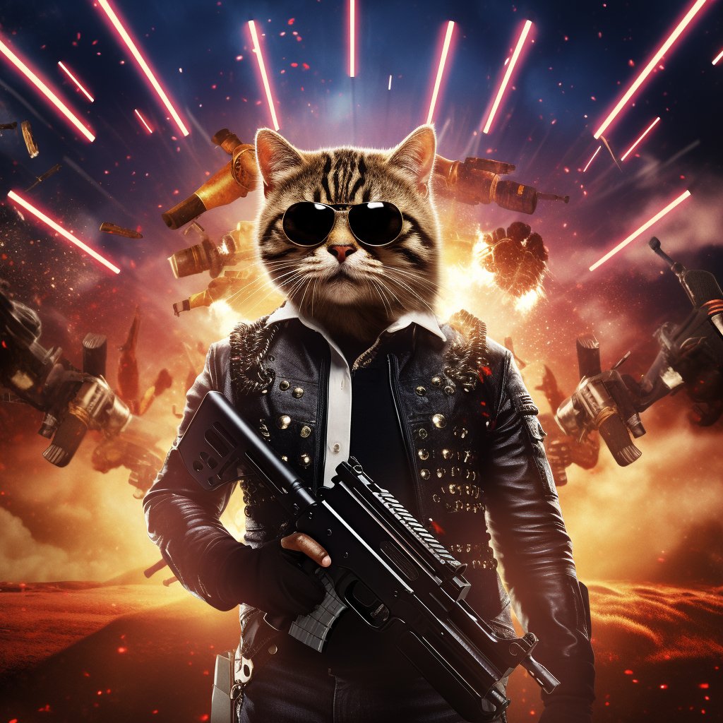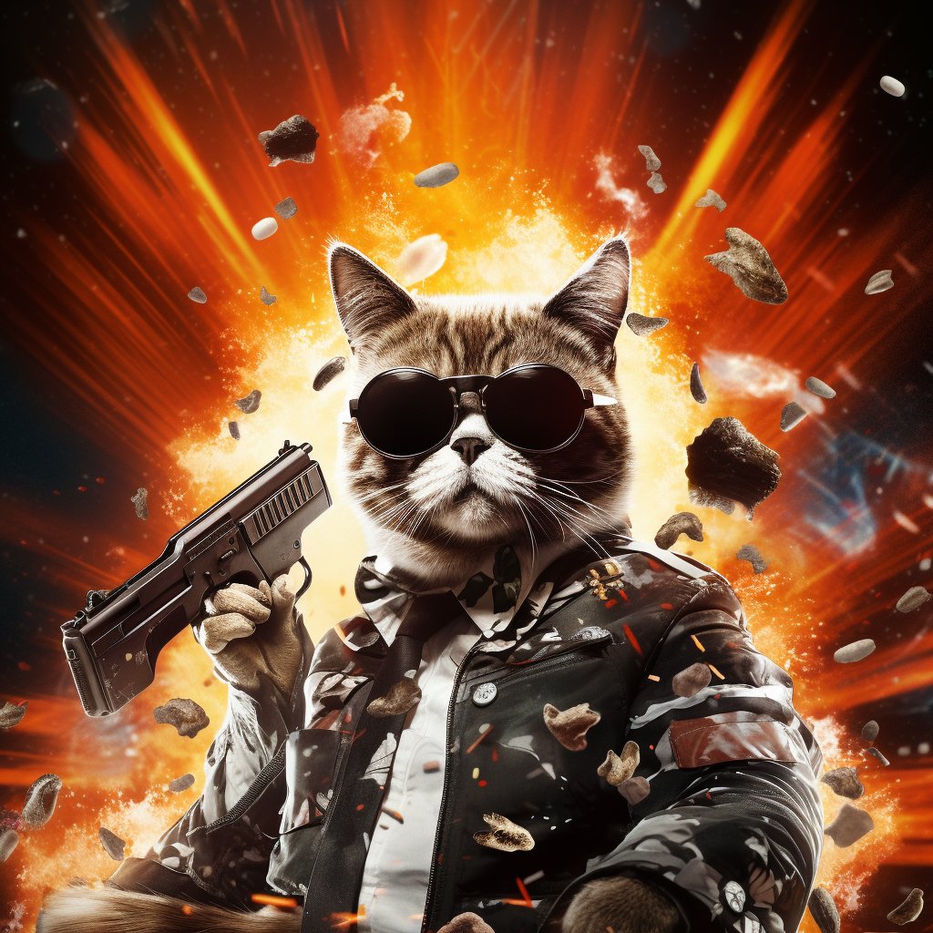 Filmplakat einer Katze, die ein schwarz-weiss gepunktetes Hemd und eine glaenzende Sonnenbrille traegt, mit Explosionen und Kanonen im Hintergrund 3