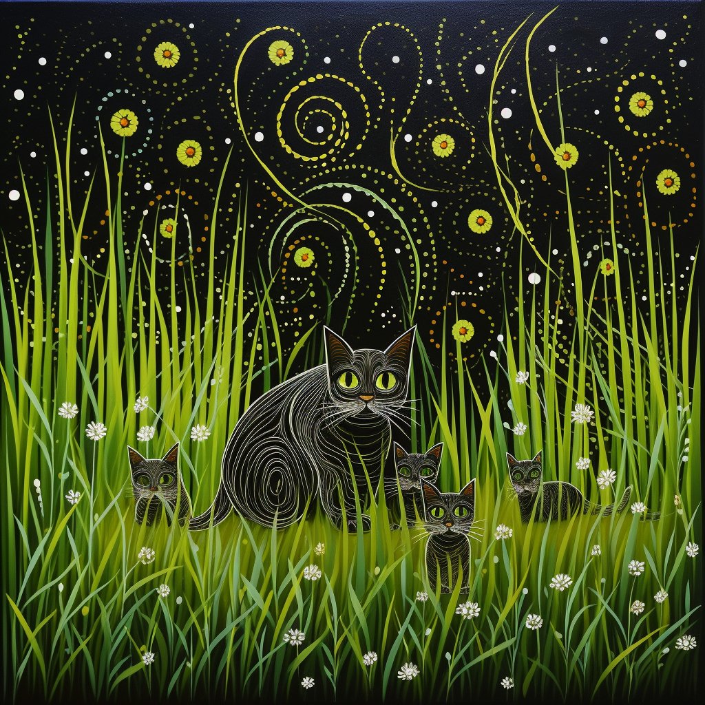 eine Katze saeugt ihre Kaetzchen im hohen gruenen Gras vor dem Haus 2