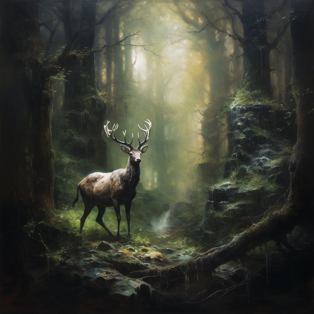 Ein koeniglicher weisser Hirsch, der inmitten von Ruinen in einem dunklen, geheimnisvollen Wald steht 4