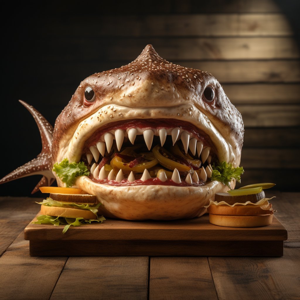 grosser Haifischkopf Cheeseburger mit Rindfleisch auf Holzbrett 1