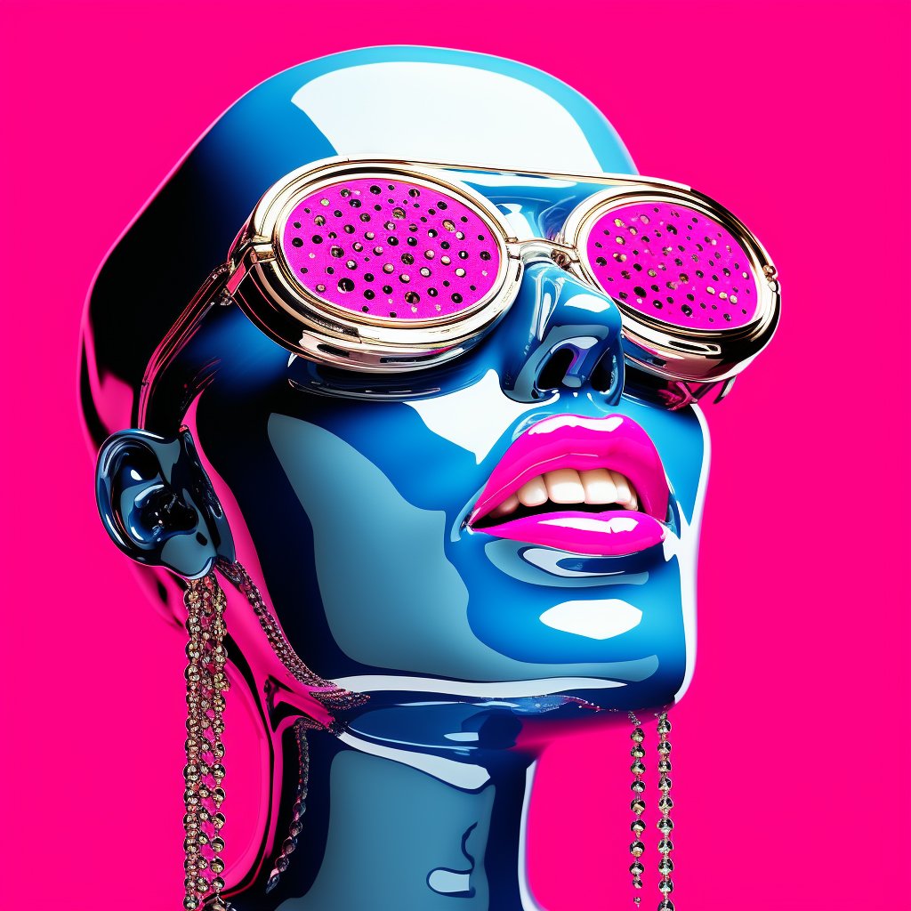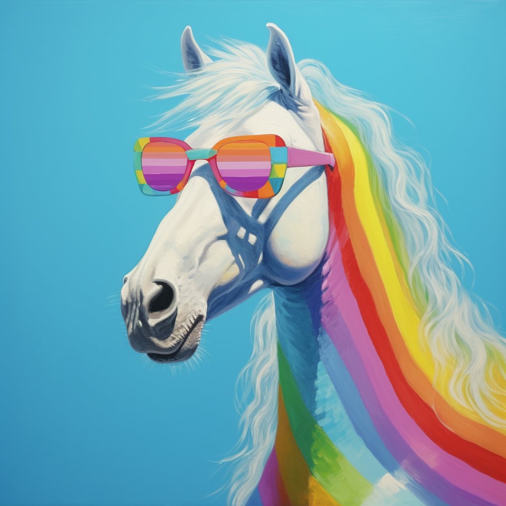 weisses Pferd mit Regenbogenbrille auf blauem Hintergrund 4