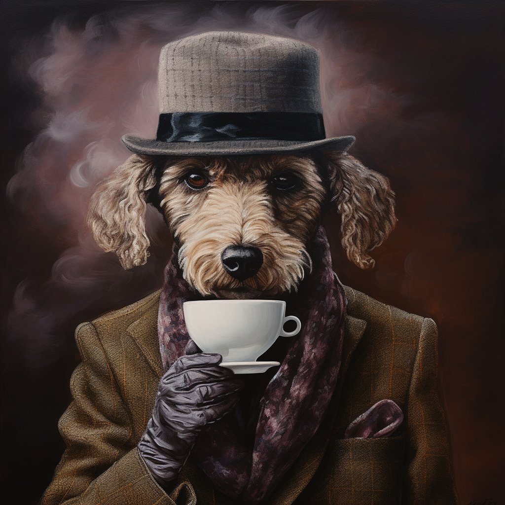 Ein kultivierter Pudel trinkt eine Tasse Tee, traegt einen Rollkragen und eine flache Muetze, rauchigen Hintergrund 2
